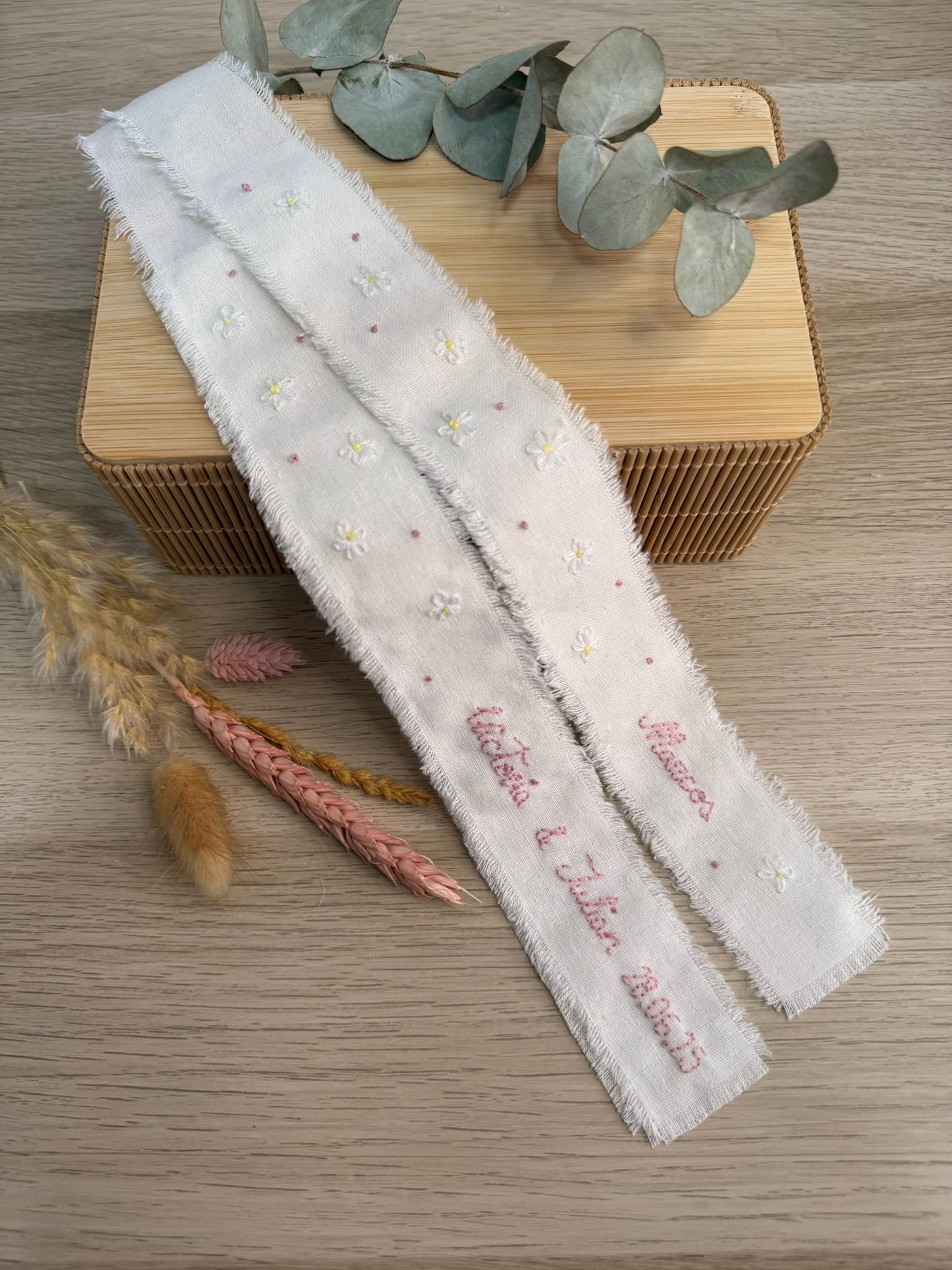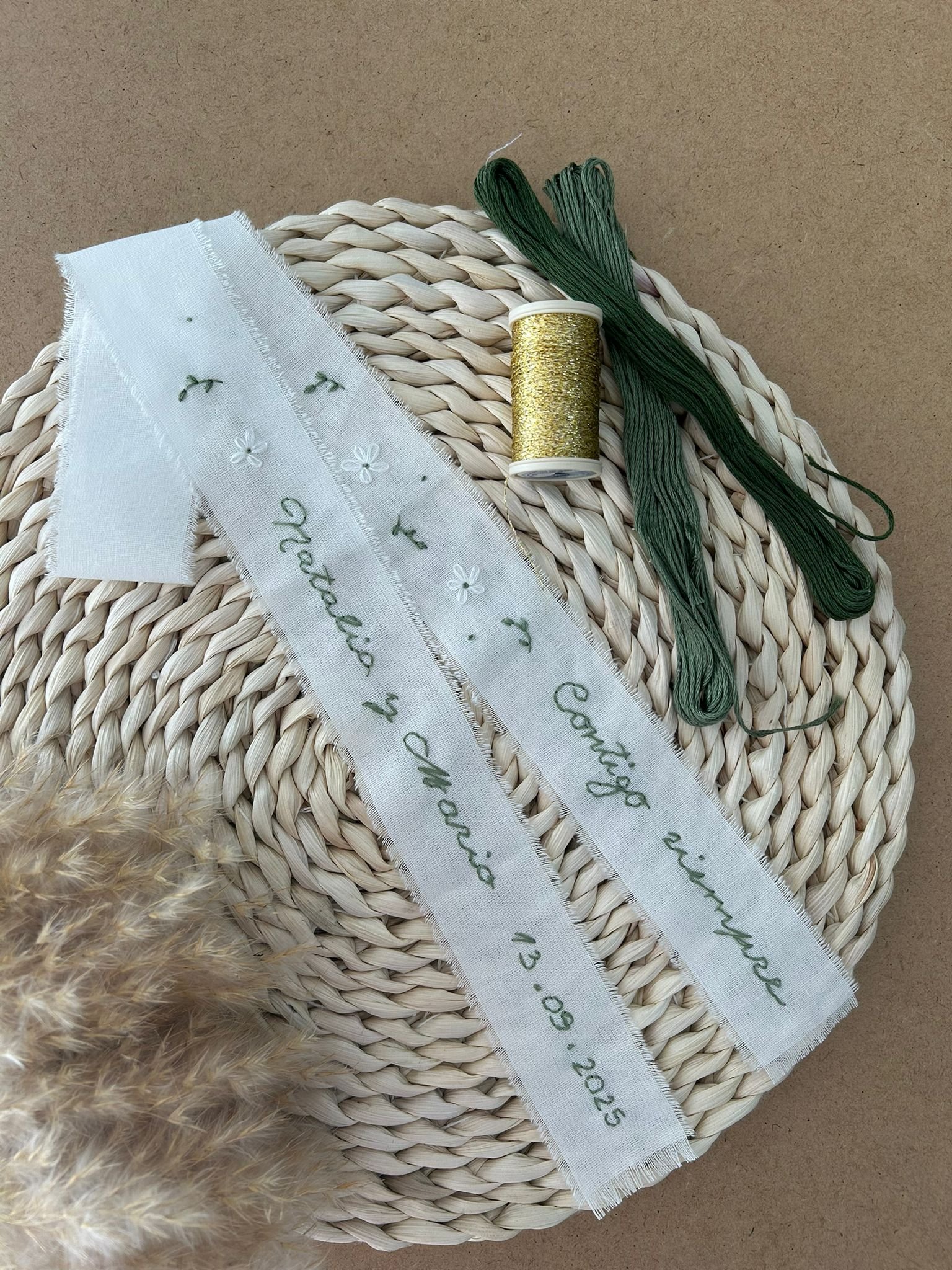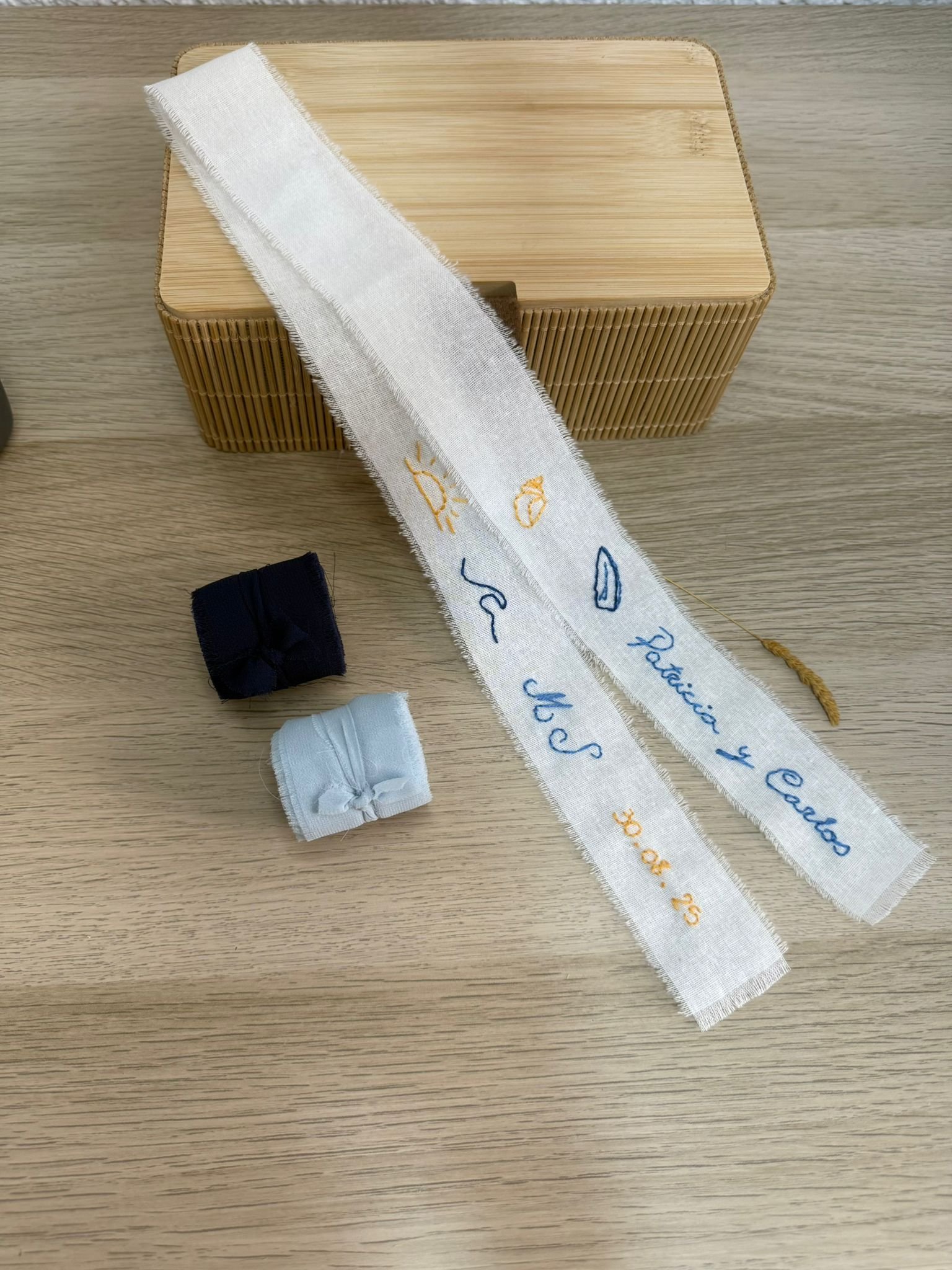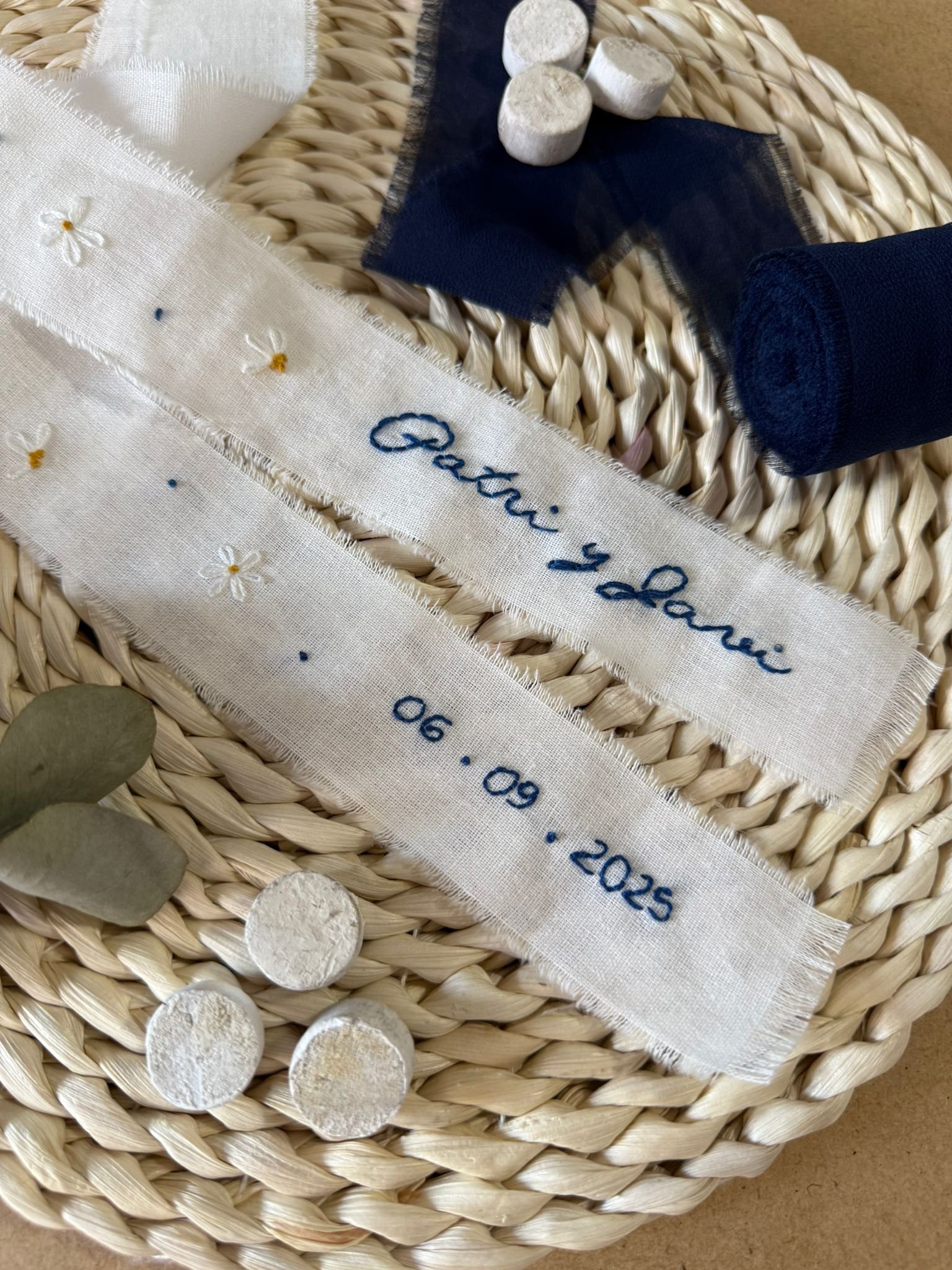 Cada lazo es bordado con mimo e hilo fino, personalizable con vuestros nombres, la fecha del enlace o una frase significativa, convirtiéndose en un recuerdo eterno de vuestro amor. Su textura suave y su caída natural aportan un toque romántico y auténtico al ramo, perfecto para novias que buscan un detalle sencillo, delicado y lleno de significado.