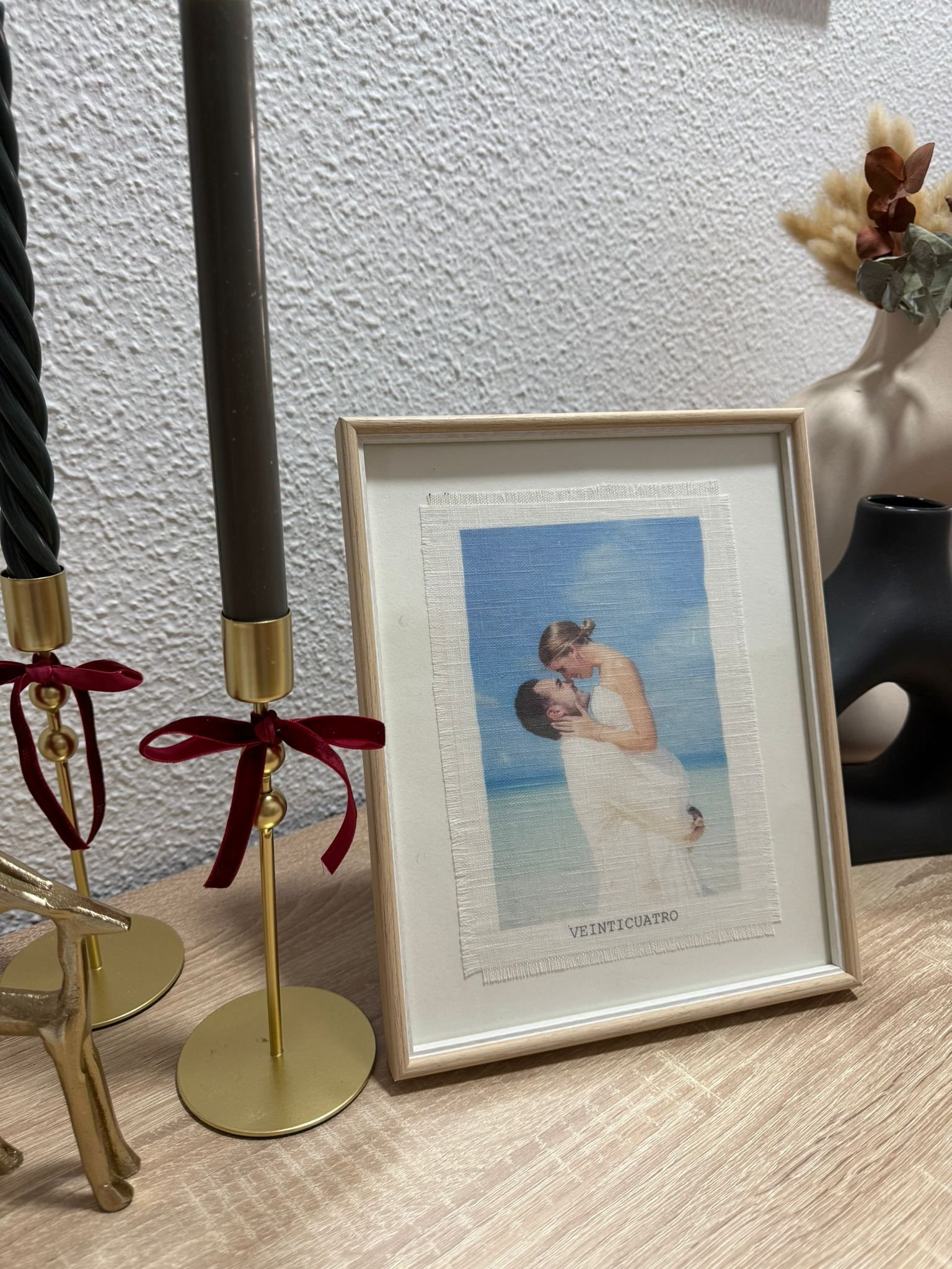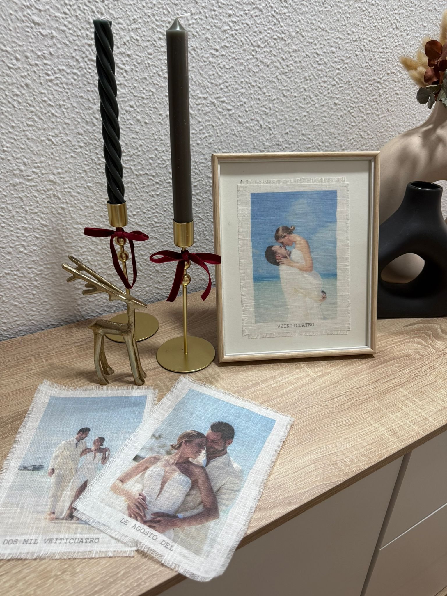 Preserva los momentos más especiales de tu boda con nuestras exclusivas impresiones fotográficas sobre tela de lino 100% natural. Su textura suave, orgánica y atemporal convierte cada imagen en una pieza artística única, perfecta para regalar a invitados, decorar rincones especiales del gran día o sorprender a la pareja.