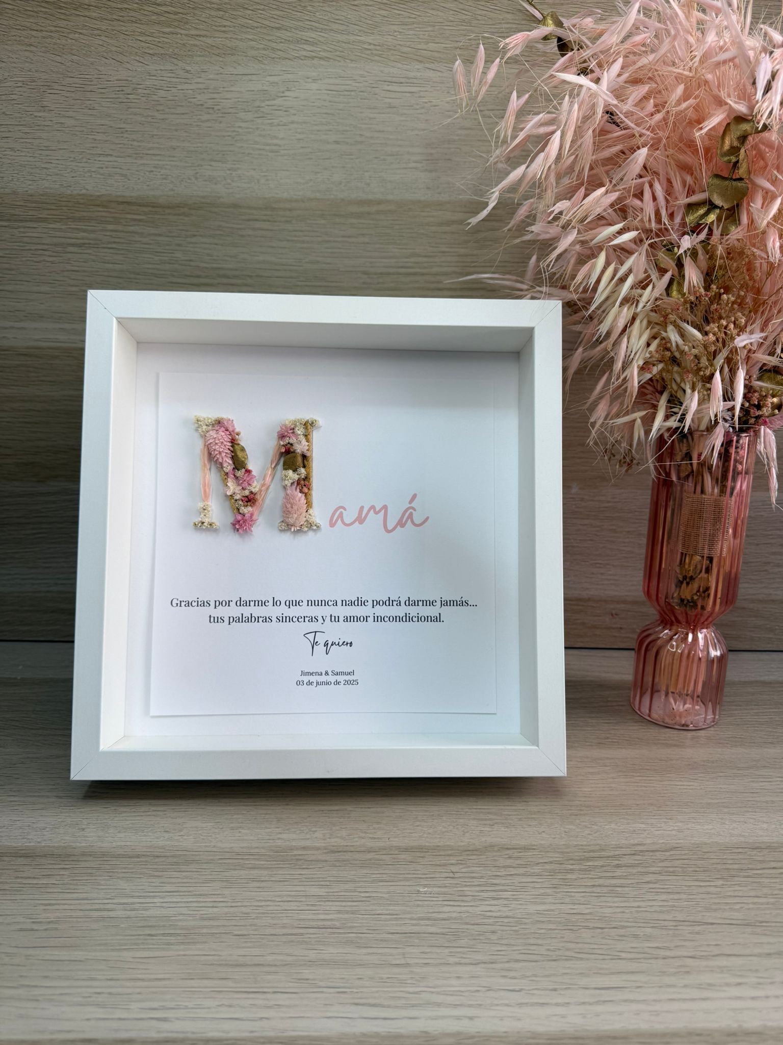 Perfecto para regalar a los novios, padrinos, damas de honor o familiares especiales, o para decorar un rincón especial del enlace, este marco combina la belleza natural con la calidez de los detalles hechos con el corazón.