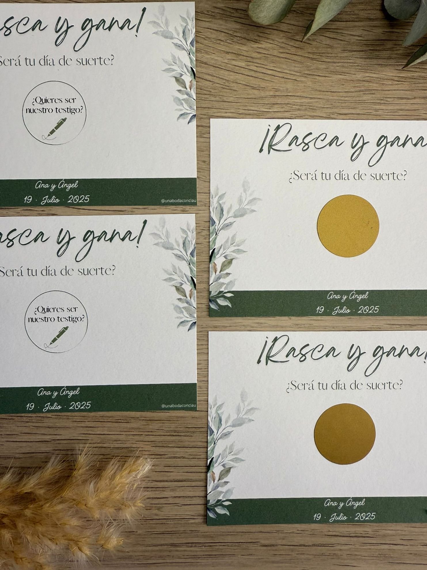 ¡Convierte tu boda en un momento aún más inolvidable con nuestras r ascas de la suerte personalizadas! Diseñadas para sorprender y divertir, estas tarjetas son el detalle perfecto para juegos, sorteos o regalos sorpresa durante la celebración.